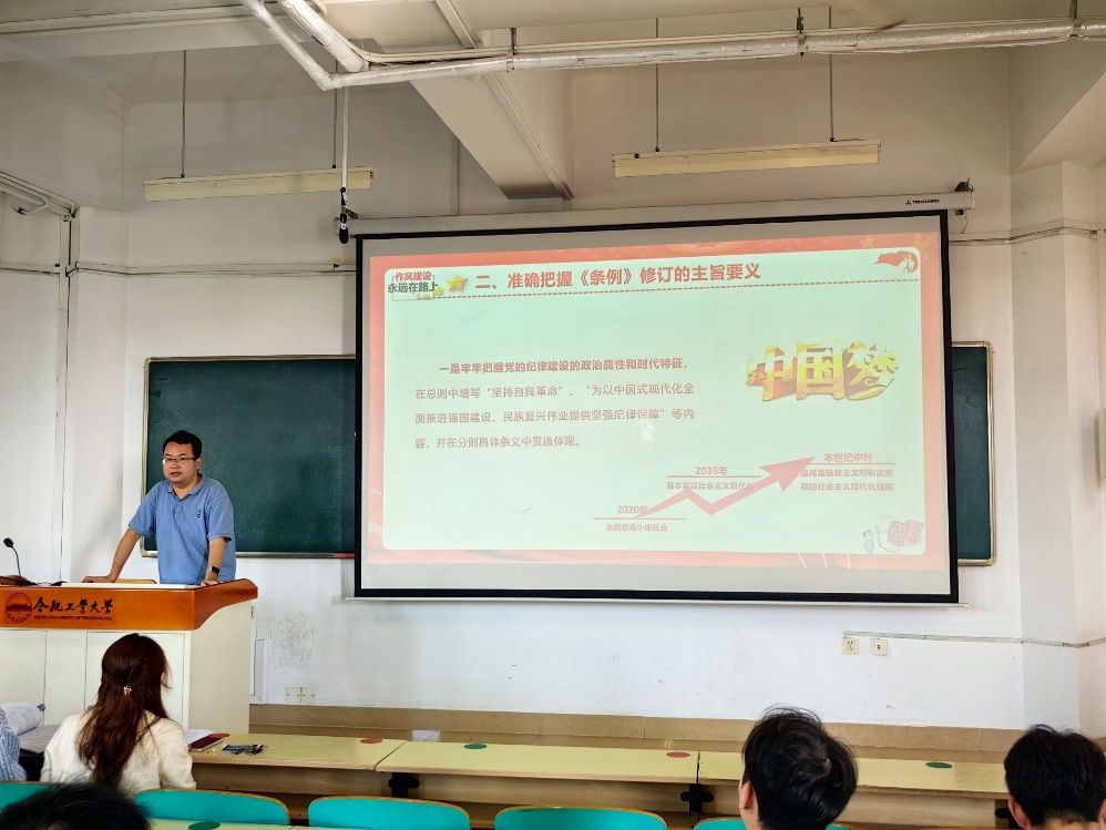 动员大会结束之后,应用物理学本科生党支部书记侯泽君主讲了《中国共产党纪律处分条例》专题党课,党课从深刻认识《条例》的重要意义,准确把握《条例》的主旨要义以及抓好《条例》的贯彻执行、以严明的纪律推进党的自我革命三个方面,对《条例》进行了深入解读。全体党员经过党课学习,深刻认识到必须把学习贯彻新修订的《条例》作为重要政治任务,领会修订《条例》的重要意义,全面准确理解《条例》的丰富内涵,严格执行和维护党的纪律,自觉将纪律要求内化于心、外化于行,确保全党目标一致、团结一致、步调一致。