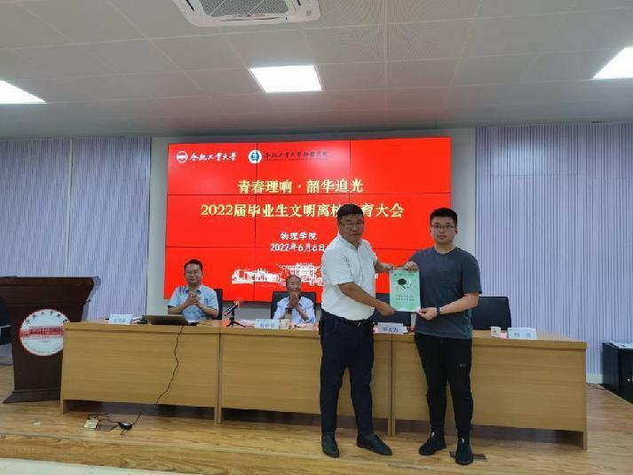 大会在校歌中拉开帷幕。2019级研究生团支部书记、校优秀毕业生葛菲菲代表毕业生发出文明离校倡议,号召大家“安全离校、文明离校、有序离校、圆满离校、感恩离校、平和离校”,各毕业班班长代表全体毕业生向公司领导递交《文明离校承诺书》,随后与会领导向应用物理学18-1班张雷等五名第二课堂活动优秀代表颁发了《第二课堂成绩单》。