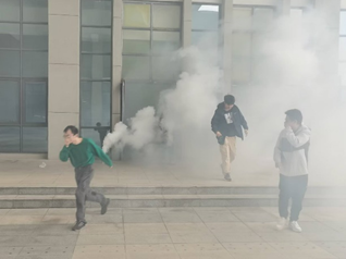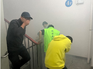 讲座结束各公司的师生回到各自的实验室,开始在科教楼D座1-6层进行安全疏散演练,随着模拟火情警报哨声从1楼响起,实战演练正式开始,现场浓烟(模拟)弥漫,气氛紧张。在现场保卫人员、教师及研究生志愿者的有序指挥与引导下,参与演练的员工们反应迅速,沉着冷静,严格按照预定疏散路线,低姿弯腰,有的同学还用衣服捂住口鼻,快速而有序地撤离至安全区域,整个疏散过程三个公司的师生配合紧密有序,完成了逃生演练。
