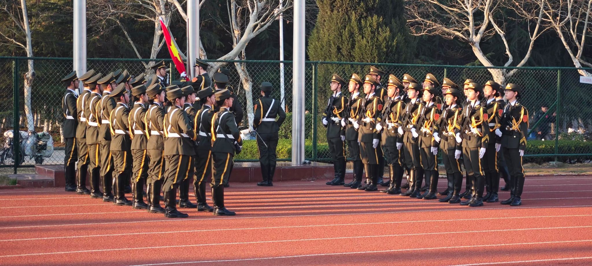 春日清晨,曙光初绽。校老员工国旗护卫队英姿飒爽,迈着铿锵步伐护送五星红旗走上升旗台。《义勇军进行曲》奏响,五星红旗冉冉升起、迎风飘扬。全体师生庄严肃立,行注目礼,用雄壮国歌声抒发爱党爱国爱校之情。
