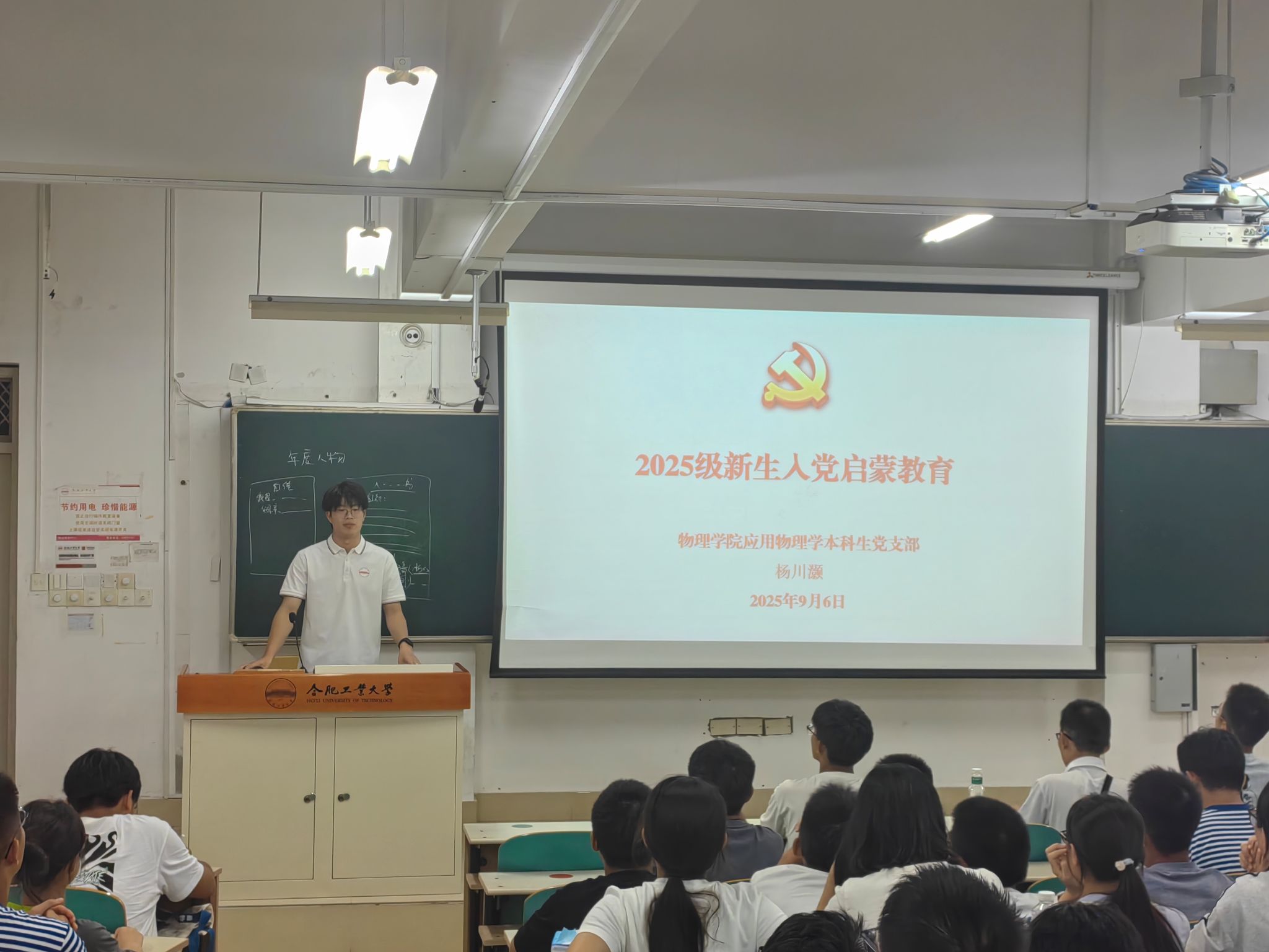 在随后的入党启蒙教育环节,应用物理学本科生党支部副书记杨川灏同学为新生作了详细介绍。他系统讲述了中国共产党的光荣传统,详细梳理了入党申请条件、培养考察流程和纪律要求,特别分享了理论学习和主题党日活动的收获体会。他鼓励有志青年积极向党组织靠拢,将个人理想融入国家发展需要,在物理研究领域勇攀高峰。