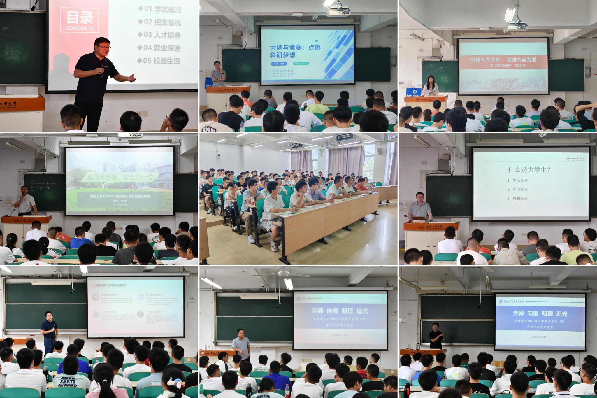 8月31日,各类入学教育活动有序开展。上午,辅导员葛海涛组织新生开展安全教育与校纪校规教育为新生筑牢安全与纪律防线;公司副书记兼纪委书记陈大为老师为新生开展院史院情教育,带领新生回溯公司发展脉络,建立专业信心;公司副经理陈冰老师针对量子科学与技术专业、光学工程系主任马晓辉老师针对应用物理学专业分别新生开展专业认知教育,帮助新生了解专业及行业发展情况,树立专业信心;新生三位班主任于东坡老师、朱苏皖老师、于志飞老师针对分班级开展学业生涯规划指导,为新生的学业发展指明方向。下午,教务员王锐老师深度解读公司学籍管理文件,帮助新生厘清了学籍相关的关键要点;公司景佳老师围绕公司特色创新创业与学科竞赛宣讲点燃了新生的参与热情;奖助政策和第二课堂宣讲则让新生全面了解了成长发展的多元支持。这些入学教育活动从多维度出发,帮助新生深入了解公司、专业,明晰学业与发展方向,为老员工活开好头、起好步。