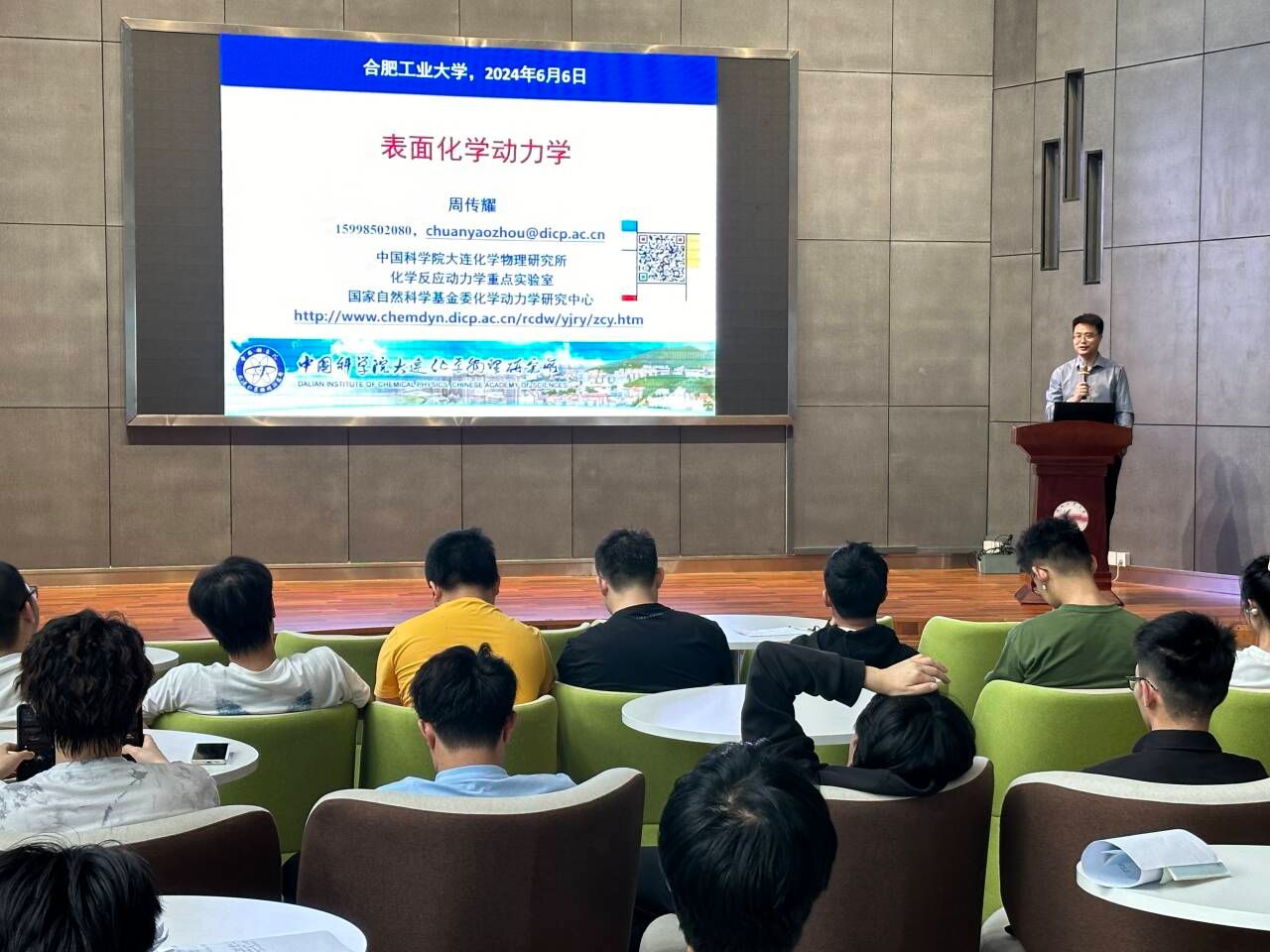 周传耀首先介绍了中国科公司大连化物所的发展以及自己的研究方向,重点围绕“表面化学动力学”的科研工作内容,向同学们介绍了利用自主研制的飞秒时间分辨光电子能谱等表面科学仪器开展的光催化体系表面化学动力学研究。
