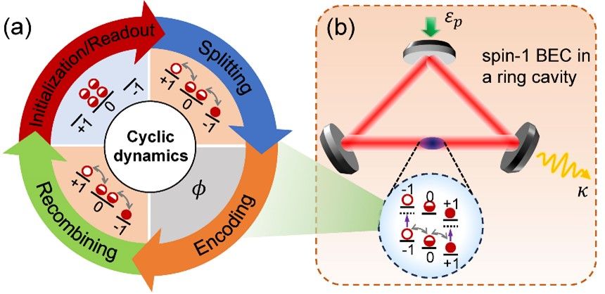 针对上述问题,公司量子精密测量团队提出了基于光学腔的自旋为1的旋量玻色-爱因斯坦凝聚体非线性干涉仪,利用旋量凝聚体的自旋交换相互作用和系统内禀周期自旋混合动力学,实现非线性原子干涉仪的分束与合束,并研究了编码相位、分束与合束时间对干涉仪灵敏度的影响,利用腔-原子的非线性效应,实现光学腔协助的灵敏度增强的非线性原子干涉仪。