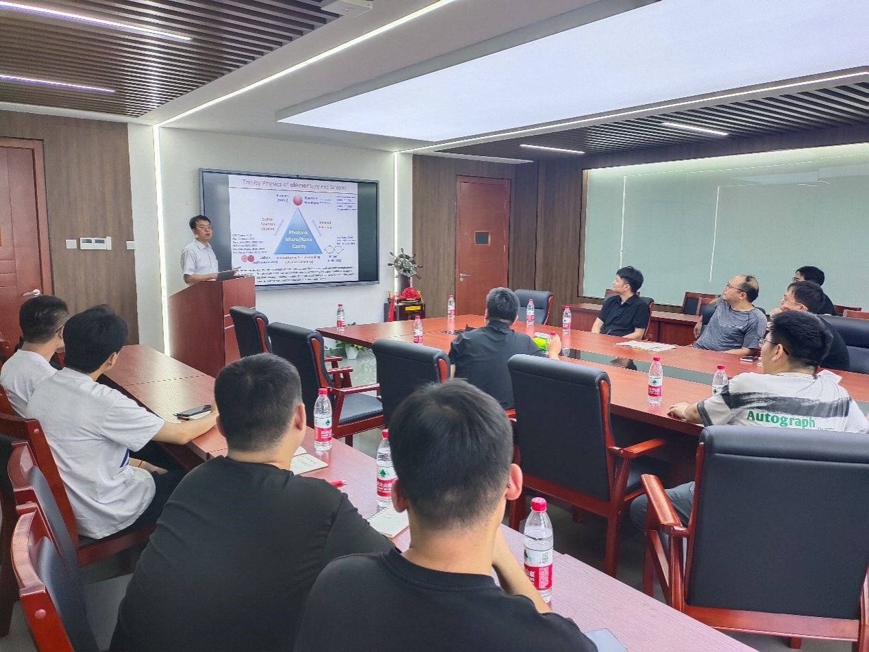 雷党愿教授首先从声学回音壁腔出发,讲述了各种光学微纳腔增强光与物质相互作用的物理机制及光学微腔在集成光学芯片中的重要作用,随后详细介绍了他们课题组最近几年基于等离激元光学纳腔增强二次谐波发射效率的一系列工作。例如,光诱导电磁非对称增强贵金属纳腔表面二次谐波产生(SHG),其SHG转换效率可以提升三个数量级;纳米颗粒二聚体-镜面耦合的非对称纳腔中等离激元诱导的磁共振及其SHG增强效应。最后雷党愿教授介绍了等离激元纳腔中量子隧穿效应诱导的二阶非线性光学现象,并展望了其在全光单分子量子传感中的应用。报告结束后,雷党愿教授与公司师生就报告内容进行了深入的沟通交流,并对师生们所提的问题进行详细解答。