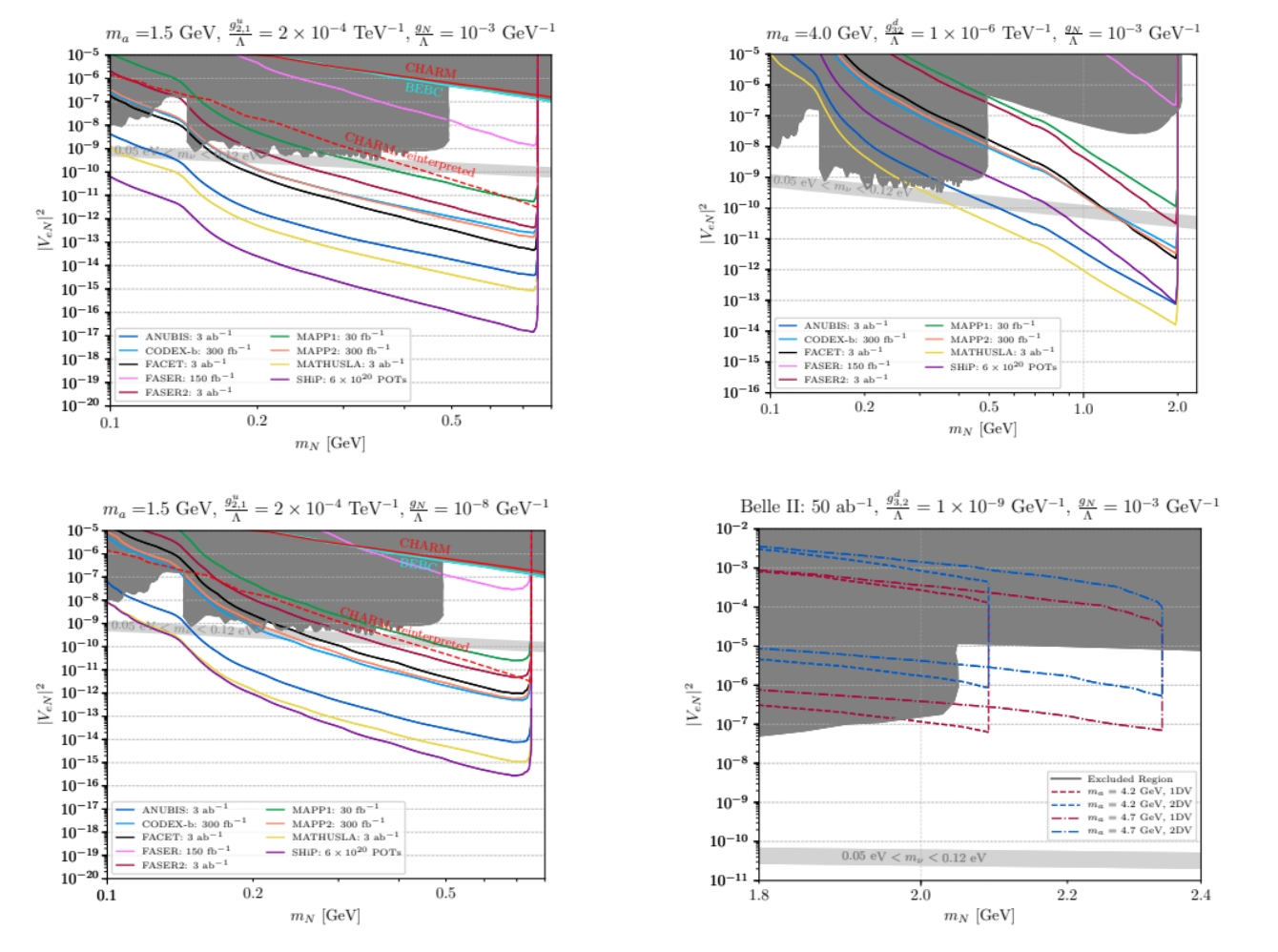 图2展示了这些研究的部分数值结果。左上和右上图中,作者限制类轴子质量分别为1.5 GeV和4.0 GeV,考虑瞬时衰变的类轴子,分别产生自D介子和B介子的衰变,在(重中性轻子质量,中微子混合强度平方)平面内展示了LHC远端探测器的灵敏度;而在左下图中,作者考虑类轴子质量为1.5 GeV,产生自D介子衰变,然而这里的类轴子是长寿命的。这些结果表明,在所考虑的这些理论情形中,对于重中性轻子质量在100 MeV到2 GeV之间,这些实验在参数空间中的敏感区域超过中微子混合强度平方的现有限制最高可达约10个数量级。基于Belle II实验的研究结果展示在了右下图中,预计对于50 ab-1的积分亮度和质量超过4 GeV的类轴子,Belle II可以对质量超过2 GeV左右的重中性轻子,探测中微子混合强度平方值超过现有限制大约一到两个数量级。这些结果大力支持了相关实验的运行,为未来相关的实验提供了强有力的理论支撑。随着未来相关实验搜索的开展,对于类轴子-重中性轻子模型的实验限制将得到进一步大幅度地提升。