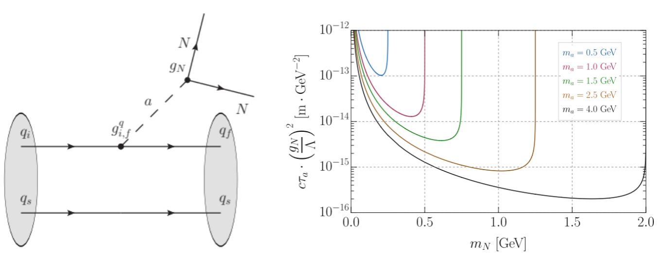 图1. 左:介子衰变产生类轴子,类轴子进而衰变至一对长寿命重中性轻子的过程。右:类轴子衰变长度