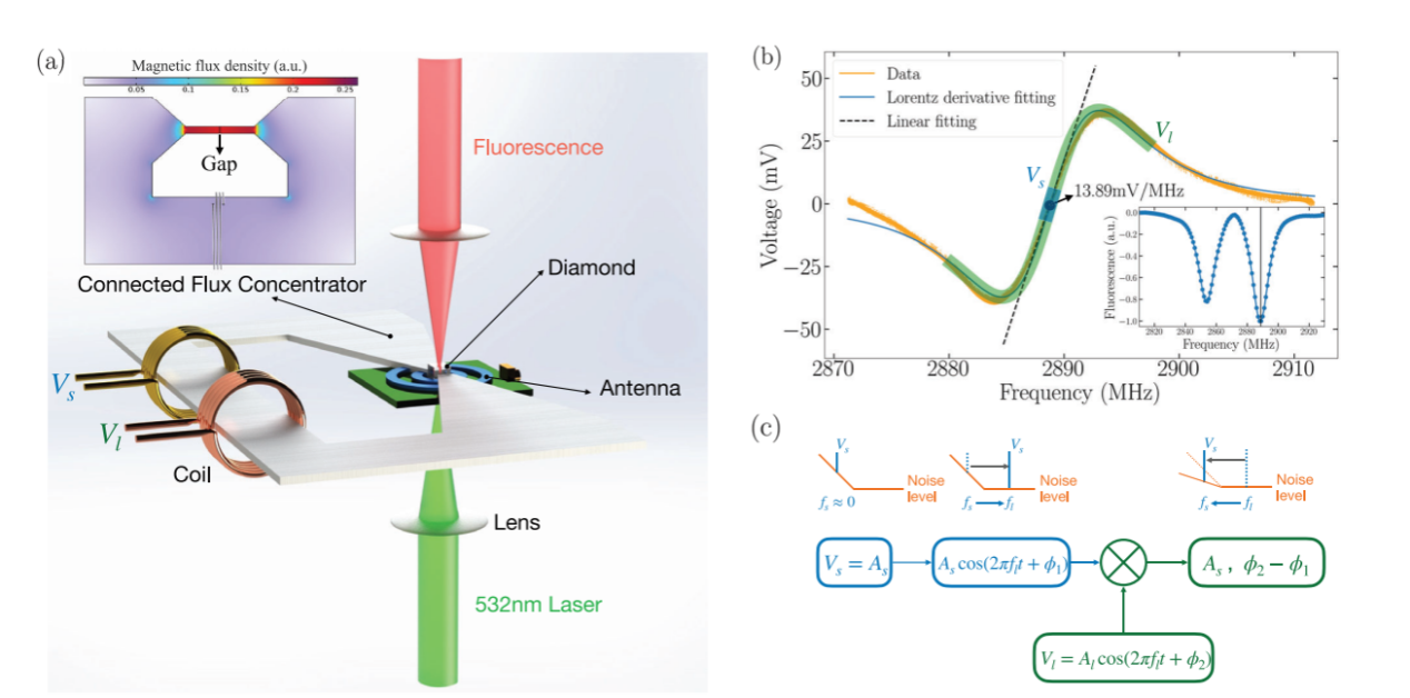 研究团队设计了一种“连通式”磁通集中器结构,通过高导磁材料将微弱电流信号放大,驱动NV色心系综进入光学检测磁共振(ODMR)微分谱的非线性响应区域,如图1。在这一区域内,非线性效应不仅实现了信号频率混频,还显著抑制了1/f低频噪声。实验结果表明,对于0.5 Hz的信号,信噪比提升了2.6倍,使得原本被低频噪声淹没的信号得以清晰提取。该研究的创新点在于通过非线性响应机制同时实现了噪声抑制和信号解调,为极低频磁场检测提供了一种新策略。这一方法不仅适用于电流磁场检测,还可拓展至地磁传感、生物磁场检测和低频磁共振测量等领域,具有广阔的应用前景。